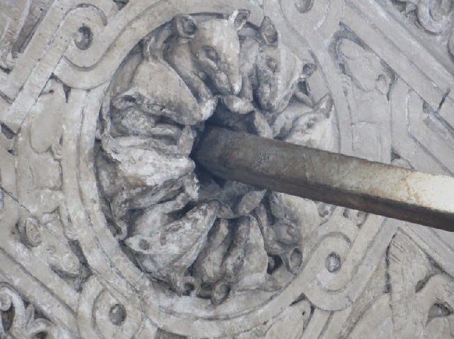 If you look up above the Lexington Avenue entrance to the Graybar Passage (the pedestrian connection to Grand Central Terminal that cuts through the Graybar Building), you'll find a surprising sculptural sight on the cables supporting the canopy: rats! The unwanted little varmints are trying to sneak into the building by climbing up the cables, but they're unable to get around a set of conical baffles similar to the devices used to prevent rats from scurrying up hawsers (mooring lines) onto docked ships. But lest you think the humans have outsmarted the crafty rodents, take a closer look and you'll see many more rats already aboard the Graybar, clustered around the hawseholes where the canopy cables are attached to the building.