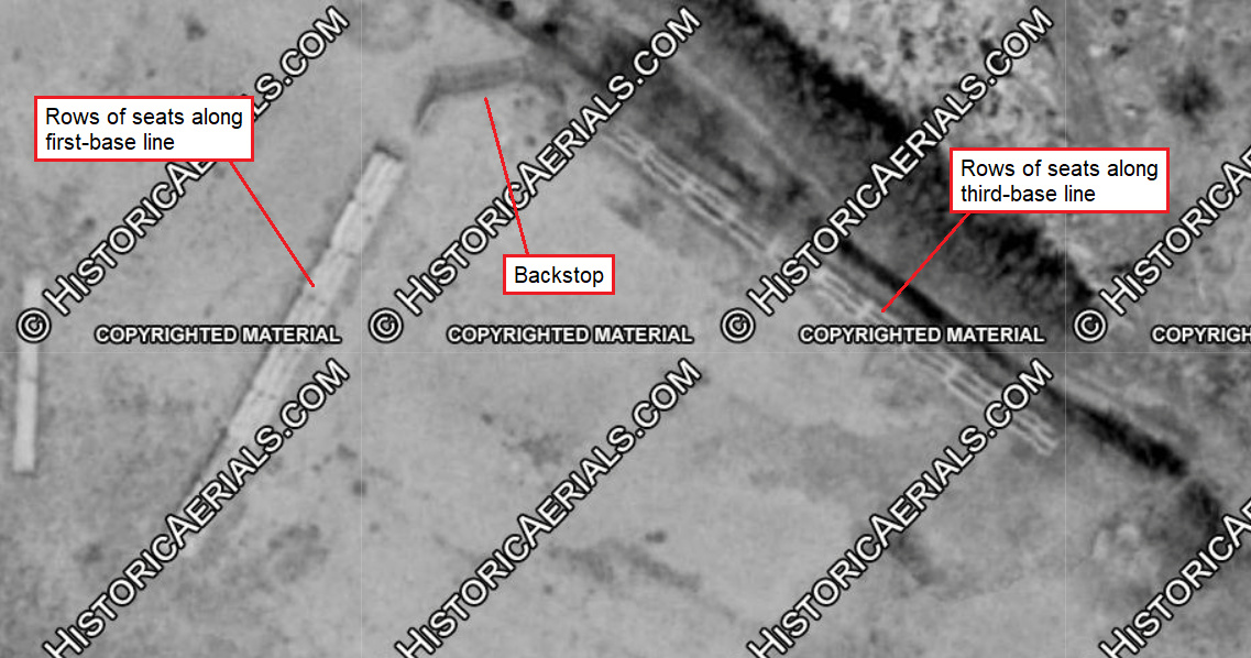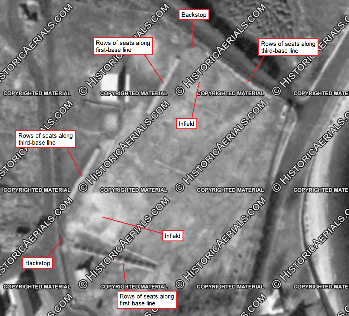 1966 aerial photo of the two Hart Island ball fields where the Ebbets Field seats were installed. Click image to go to aerial photo viewer.